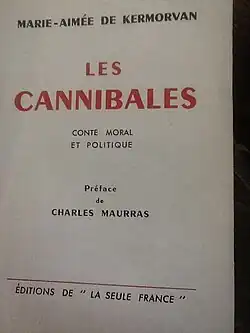 In 1929 her book of poetry, Soleil de France: poèmes, was published in France by the Librairie de la Revue française (now called Editions Gallimard)[2] Kermorvan's 1936 book had an introduction by Raymond de La Tailhède.[3] Her 1951 book, Les Cannibales, involved politics and morality and it had a preface by her nationalist friend Charles Maurras.[4]