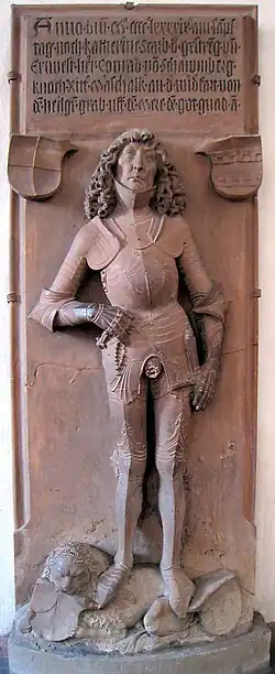 Although most of the sepulchral art was destroyed by the fire of 1945, the interior still features a number of tombs and epitaphs such as the epitaph for Jörg Schrimpf (d. 1556) by Peter Dell der Jüngere and the epitaph for Anna Külwein (d. 1563). Most notable is the grave of Konrad von Schaumburg (d. 1499) by Tilman Riemenschneider. This was ordered in 1500 and was originally colored, the armor was golden. This sculpture was also heavily damaged by fire in 1945 and restored after the war.[1][2]: 8