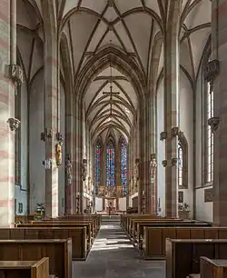 The chapel is a mixture between a basilica and a hall church that was popular in the late-Gothic period. It has three aisles and five bays. The middle aisle is only slightly higher than the side aisles. The roof rests on octagonal pillars. The eastern choir extends three bays. The proportions are somewhat skewed towards the vertical: on a plan of 26.5 meters by 18 meters the nave rises 21.5 meters in the center, 20 meters in the side aisles.[1][2]: 6
