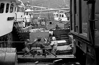 Unloading fish on the fishing boat "Silvery Sea" in Mallaig harbour, Scotland, in 1977. This boat sank with all hands lost after a collision off the Danish coast in 1998.