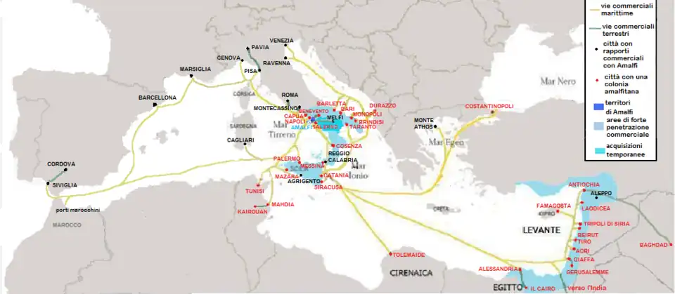 The economic recovery that took place in Europe starting with the 9th century, combined with hazardous mainland trading routes, enabled the development of major commercial routes along the Mediterranean coast. The growing autonomy acquired by some coastal cities gave them a leading role in this development. As many as six of these cities — Amalfi, Venice, Gaeta, Genoa, Ancona, and Ragusa — began their own history of autonomy and trade after being almost destroyed by terrible looting, or were founded by refugees from devastated lands.[10] These cities, exposed to pirate raids and neglected by central powers, organized their own defence autonomously, coupling the exercise of maritime trade with that of their armed protection. Thus, in the 9th, 10th, and 11th centuries, they were able to go on the offensive, obtaining numerous victories over the Saracens, starting with the historic Battle of Ostia in 849. The traffic of these cities reached Africa and Asia, effectively inserting itself between the Byzantine and Islamic maritime powers, with which a complex relationship of competition and collaboration was established for the control of the Mediterranean routes.[8]