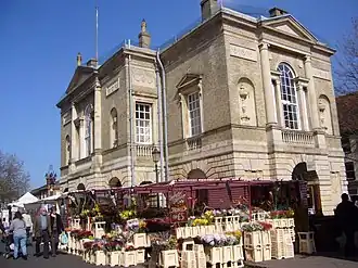 The site of the current building was originally occupied by a simple market cross in the form of a high cross. It was dismantled and replaced by a timber structure which was commissioned by the Bury St Edmunds Guildhall feoffees and completed in 1584. It accommodated an open corn market on the ground floor, and a clothiers' hall on the first floor. It was destroyed in a great fire which broke out in Eastman Street in 1608 but was rebuilt in 1620.[2] It was described as a "very fayer large house for corn sellers wherein they may stand in their great ease very comodiouslye in the heat of somer and also in the tyme of reyne and cold wet winter".[3]