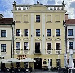 - Tenement at 14 Rynek Street: A two-story tenement with glassed-in arcaded arches. Rebuilt in the 16th century with an arcade and a second floor, it was damaged in the 1735 fire and rebuilt without the arcade by 1796. A second floor was added in 1866, and the arcade and original interior were restored between 1960 and 1962.[29] From 1767 to 1787, it housed Tarnów's first royal post office, commemorated by a plaque. It now contains a restaurant and hotel. It was listed in 1998.[12]