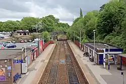 The station has two side platforms, each 153 yards (140 m) long; platform 1 can only be reached by a footbridge (with lifts) over the tracks and platform 2 can be accessed from the ticket office. The ticket office is staffed during the day; there are benches, toilets and a waiting room on the platform.[6] Passenger information systems include dot-matrix displays and an automated public-address system announce approaching services. Timetable information posters are provided and help points allow passengers to contact railway staff. To the east of the station, there is a free car park and the nearest bus stops are 150 metres (160 yd) away on Brabyns Brow.[7]