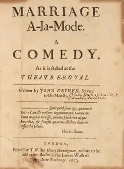 Marriage à la Mode is a Restoration comedy by John Dryden, first performed in London in 1673 by the King's Company. It is written in a combination of prose, blank verse and heroic couplets. It has often been praised as Dryden's best comedic endeavour, and James Sutherland accounts for this by observing that "the comic scenes are beautifully written, and Dryden has taken care to connect them with the serious plot by a number of effective links. He writes with ... one of the most thoughtful treatments of sex and marriage that Restoration comedy can show."[1]