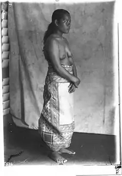 The men wore a fringe skirt of native materials about 25 to 30 inches (60 to 80 cm) long. Women traditionally[4] wore two mats about a yard (metre) square each, made by weaving pandanus and hibiscus leaves together,[2] and belted around the waist.[5] Children were usually naked.[2]
