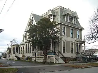 The Martin L. Kelsey House stands just north of downtown Burlington, on the west side of Elmwood between Pearl and Grant Streets in a mixed residential-commercial area. It is a 2+12-story wood-frame structure, with a mansard roof on the main block providing a full third floor. Ells of decreasing size and height extend to the rear of the house, which is set on a small parcel now surrounded by parking lots. The exterior has a large number of decorative elements borrowing from a variety of architectural styles. The mansard roof has a flared lower section, and is crowned by a band of wooden squares with recessed panels. Its dormers have steeply pitched gabled roofs, with elaborate Stick style decoration, and whose windows are framed by Italianate moulding. A large gabled section projects on the left side also with Stick decoration and a finial at the top of the ridge. The main facade is three bays wide, with bands of paneled woodwork below the groundfloor windows and between the first and second-floor windows. An entrance is in the right bay, with an Italianate porch featuring a valance of square panels similar to those that crown the roof. A second porch with similar styling extends along the left side to the projecting section.[2]