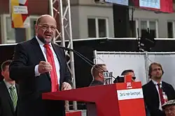 Martin Schulz (born 20 December 1955)[1] is a German politician who was a Member of the European Parliament (MEP) from Germany from 1994 to 2017 and a Member of the Bundestag (MdB) from 2017 to 2021. During his tenure he was Leader of the Progressive Alliance of Socialists and Democrats from 2004 to 2012, President of the European Parliament from 2012 to 2017 and Leader of the Social Democratic Party from 2017 to 2018.[2]