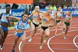 ![]() Martina Amidei (with the Italian jersey) receives the baton from Gloria Hopper at the 2016 European Athletics Championships | |