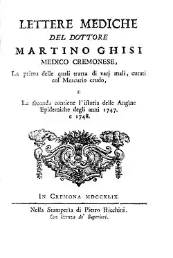 Ghisi was born in Soresina and studied medicine under Paolo Valcarenghi. After his studies in Florence at the Santa Maria Nuova hospital where he studied under Antonio Cocchi (1695-1758), Giuseppe Maria Saverio Bertini (1695-1756), and Angelo Nannoni (1715-1790), he returned to Cremona where he practiced. In 1745 he studied diseases of livestock and wrote a report to Francesco Roncalli Parolino (1692-1769) who published it in 1747. In 1749 he reported on malignant angina, in fact diphtheria, comparing it with livestock diseases. Ghisi described the climate and conditions when the epidemic occurred and then described paralysis of the velum palatinum and the tumefaction of the submaxillary glands. He also examined changes in the bronchi, pulmonary edema and the strain it caused to the right side of the heart. Ghisi called the pharyngeal form of diphtheria as Angina strepitosa perfida mortalis and compared it with the tracheal form. He noted that in children, there was tube-shaped false membrane in the trachea that was coughed up.[1] This was published in his only published work - Lettere mediche del Dottor M. Ghisi which also included a section on the use of mercury for treatments.[2][3][4]