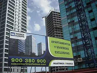 In March 2015, the company filed for bankruptcy, holding assets worth €2.4 billion ($2.7 billion) with debts worth €7.0 billion, making its collapse one of the biggest bankruptcies in Spanish history.[7] Trade of the company stocks were abruptly suspended, leaving no chance for its investors to unload them.[8] The liquidation of the company started the following month.[9] The company was banned from trading on the stock exchange in October 2015.[10] In July 2018, Martinsa-Fadesa entered the final phase of liquidation. The website martinsafadesaliquidacion.es was set up to follow the liquidation process.[11] In November 2018, in the aftermath of the crash, the lawyer Antonia Magdaleno was found responsible for the company's debt and sentenced to 4 years in jail.[12]