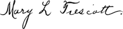 Mary Luella Trescott was born in Huntington Township, Luzerne County, Pennsylvania in 1861,[1] to Miller Barton Trescott and Permelia Stevens.[2] She used variations of her name Mary L. Trescott and M. L. Trescott. She was a woman attorney and held offices in Luzerne County, Pennsylvania.