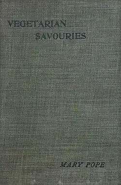 In 1904, Pope published the cookbook Vegetarian Savouries,[12] with a foreword authored by Lady Paget.[13] The book, 79 pages in length, contains a number of vegetarian savoury recipes, ranging from "Gravy for Stock" made with lentils to "Plasmon Butterflies".[14] In her introduction, Pope states:[15]