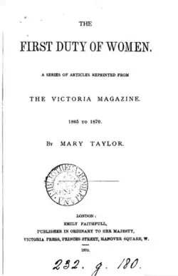 - ^ Taylor, Mary (1870). The First Duty of Women. London: Victoria Press. p. 156.