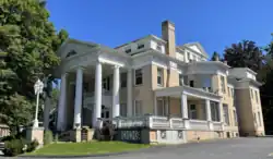 Located at 815 W. Seventh Ave., the Austin Corbin house is a Colonial Revival home built in 1898 and designed by Kirtland Cutter. It was built as a 17-room mansion for Austin Corbin, son of Daniel Corbin, and his wife. The younger Corbin worked in his father's business as vice president of the family's three railroad lines, a sugar company, and irrigation ventures. The two Corbins' homes were built at the same time, designed by the same architect, and just a block apart, but the younger Corbin's home was designed to be far more imposing from the exterior. Located on a seven-acre lot overlooking the city, the northern façade features a two-story portico at the central entrance with six Ionic columns supporting the pediment.[2]