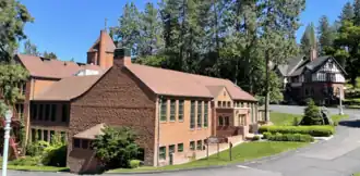 Located at 703 W. Seventh, the F. Lewis Clark House, or Undercliff House as it was called by Clark and is commonly known, is a Tudor Revival home designed by Kirtland Cutter and built in 1896. The home would host numerous high-society functions and social events in its early years. The home was designed to host gatherings like those, with its plans including a billiard room, a ballroom, a large porch on the northern façade overlooking the city, and formal English gardens with red brick paths that matched the brickwork on the home.[2] Like the other extant homes in the Marycliff section, it is located along the hillside overlooking downtown, though it is the farthest back of the remaining homes and closest to the basalt cliff. A number of basalt outcroppings are located around the home, some of which are close enough that they were included in Cutter's design for the structure.[12] A cistern was built adjacent to the home out of basalt rocks. There was also an ice house on the property as well as several greenhoues. Prior to the construction of Marycliff High School in 1929, the manicured lawns and gardens sloped down from the house to Seventh Avenue, where a gatehouse was located.[2]
