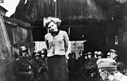 Masha Bruskina with fellow resistance members before hanging. The placard reads "We are partisans who shot at German troops", Minsk, October 26, 1941