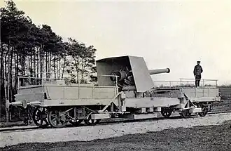 The guns sat on a Vavasseur mount with a gun shield which was bolted to a four-axle, well-base flatcar. The Vavasseur mount was a type of top-carriage recoil system where the gun sat on a cradle that held the trunnioned barrel. When fired a combination of hydraulic buffers and inclined rails returned the gun to position. Once in position, the timber firing platform under the center of the carriage was lowered onto the rails and the carriage was lifted by four jackscrews through the floor of the car. The combination of jackscrews, outriggers, and rail clamps stabilizing the carriage during firing.[4] The gun was capable of 360° of traverse at elevations from +10° to +35° with a maximum range of 12.7 km (7.9 mi) and provided counter-battery fire during the Battle of Verdun.[5]