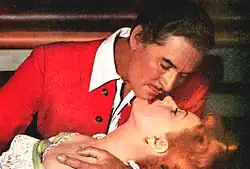 O'Hara instead starred in the Technicolor war picture, To the Shores of Tripoli, her first Technicolor picture and first on-screen partnership with John Payne, in which she portrayed Navy nurse Lieutenant Mary Carter.[64] Though the film was a considerable commercial success, becoming a benchmark for "service pictures" of the era, O'Hara later commented that she "couldn't understand why the quality of his (Bruce Humberstone's) pictures never seemed to match their impressive box-office receipts".[64] Malone wrote that "nobody in the film seemed to have lived life. The character's emotions, like their uniforms, seem too streamlined".[65] O'Hara next played an unconventional role as a timid socialite who joins the army as a cook in Henry Hathaway's Ten Gentlemen from West Point (1942), which tells the fictional story of the first class of the United States Military Academy in the early 19th century. The film was disagreeable to O'Hara because Payne dropped out and was replaced by George Montgomery, whom she found "positively loathsome".[66] Montgomery attempted to make a pass at her during the production, prolonging his kiss with her after the director had yelled "cut".[67]
