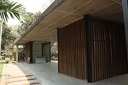 The foundation stone of the project to convert Kazi Nazrul Islam's tomb area into a mausoleum was laid on 25 May 1999 and the mausoleum was inaugurated on 27 August 2009 by Prime Minister Sheikh Hasina ten years later.[5] On 16 February 2011, two persons named Jaynath Nandi and Debashish Bhattacharya from West Bengal traveled to Bangladesh on a bicycle with soil from the grave of Kazi Nazrul Islam's wife Pramila Kazi located in Churulia. On 28 February, they placed that soil on the grave of Kazi Nazrul Islam.[6] The mausoleum complex, designed by Muzharul Islam, covers the tombs of Kazi Nazrul Islam, Zainul Abedin, Quamrul Hassan, Muzaffar Ahmed Chowdhury and Abdul Matin Chowdhury.[7]