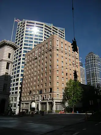 The Bergonian Hotel was built by Stephen Berg, a prominent Seattle realtor and builder, who had previously built a number of other hotels in the city, as well as apartments and family homes.[2] It was designed by the firm of Stuart & Wheatley, who had worked with Berg on several previous projects that incorporated his surname (The Stephensberg and Berg, later Biltmore, apartments on Capitol Hill).[3] With 240 rooms, it was constructed in six months at a cost of $750,000, opening to the public ahead of schedule on the evening of July 16, 1927.[4][5][6] The hotel was sold in 1933 and renamed the Hotel Mayflower. The hotel was renamed the Mayflower Park Hotel in 1974, after it was bought for $1.1 million by a limited partnership that gave control to Marie and Birney Dempcy. The hotel had been in foreclosure and was in need of repairs, necessitating an extensive renovation.[5][7]