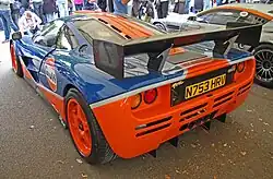 Finally, Murray relented and agreed to modify the F1 into a racing car, agreeing to build several chassis for competition in the 1995 season. An unused F1 chassis which was meant to become #019 was taken by McLaren and modified by the company as a developmental prototype. Because of the similarity to a race car, extensive modification was not needed to actually turn the F1 into a racing car. Bodywork modification saw the addition of various cooling ducts, most noticeably a large one in the center of the nose and two placed in the location of the storage lockers on the side of the car. A large adjustable fixed wing was added to the rear of the car. Even the 1995 versions of F1 GTR generated enough downforce to run along the ceiling at 100 mph.[1] The interior was stripped of all luxuries and given a full racing cage. Carbon brakes replaced the stock units. Because of the rules at the time, the BMW S70 V12 engine was required to use an air restrictor to limit power output to around 600 PS (592 hp; 441 kW), making the racing car less powerful than the road car, yet faster and more nimble due to a lowered overall weight. Features such as the central seating position, Butterfly doors, and even the standard gearbox were retained. McLaren co-ordinated a 24-hour test at Magny-Cours to find weaknesses in the car and develop upgrades to supply to the teams.[2]