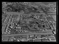 McLennan Hills (also Te Aponga o Tainui) is one of the volcanoes in the Auckland volcanic field. It was a group of cratered scoria mounds up to 45 m high, before it was quarried away. A 1940 aerial photo (in Searle's book) shows a crater around 100 m wide, one around 50 m wide, and 2 or 3 smaller craters. McLennan Hills, alongside neighbouring Ōtāhuhu / Mount Richmond, were the sites of fortified pā in pre-European times, important due to their location between the Waitematā Harbour/Tāmaki River and the Manukau Harbour.[1] Since the European settlement of Auckland, the scoria cone was quarried.[1] The former quarry site was used for greenhouses before being redeveloped for housing.