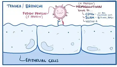 Drawing of the measles virus attaching to the lining of the trachea