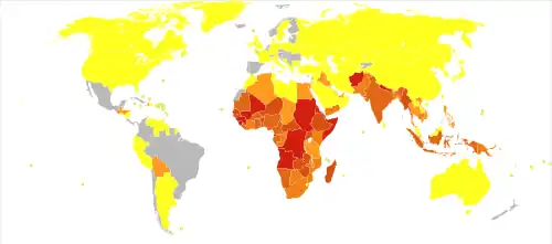 In 2011, the WHO estimated that 158,000 deaths were caused by measles. This is down from 630,000 deaths in 1990.[87] As of 2018, measles remains a leading cause of vaccine-preventable deaths in the world.[19][88] In developed countries the mortality rate is lower, for example in England and Wales from 2007 to 2017 death occurred between two and three cases out of 10,000.[89] In children one to three cases out of every 1,000 die in the United States (0.1–0.2%).[90] In populations with high levels of malnutrition and a lack of adequate healthcare, mortality can be as high as 10%.[7][5] In cases with complications, the rate may rise to 20–30%. In 2012, the number of deaths due to measles was 78% lower than in 2000 due to increased rates of immunization among UN member states.[18] Between 2000 and 2016, global cases decreased by 84%; by 2019 cases had increased to a total of 870,000, the highest since 1996.[39]