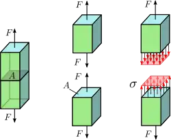 A common situation with a simple stress pattern is when a straight rod, with uniform material and cross section, is subjected to tension by opposite forces of magnitude along its axis. If the system is in equilibrium and not changing with time, and the weight of the bar can be neglected, then through each transversal section of the bar the top part must pull on the bottom part with the same force, F with continuity through the full cross-sectional area, A. Therefore, the stress σ throughout the bar, across any horizontal surface, can be expressed simply by the single number σ, calculated simply with the magnitude of those forces, F, and cross sectional area, A. On the other hand, if one imagines the bar being cut along its length, parallel to the axis, there will be no force (hence no stress) between the two halves across the cut. This type of stress may be called (simple) normal stress or uniaxial stress; specifically, (uniaxial, simple, etc.) tensile stress.[13] If the load is compression on the bar, rather than stretching it, the analysis is the same except that the force F and the stress change sign, and the stress is called compressive stress.
