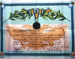 1. ^ "Περὶ ἀπονομῆς ἠθικῶν ἀμοιβῶν εἰς τοὺς ἀγωνιστὰς τοῦ Μακεδονικοῦ ἀγώνος 1903—1909" [On the award of moral rewards to the fighters of the Macedonian Struggle 1903—1909]. Government Gazette of the Hellenic Republic. I (225): 1650–1651. 23 July 1931.