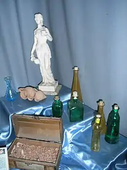 Amphorae, scented body oil, perfume bottles (unguentarium), rose petals and a figurine, all from Ancient Rome.