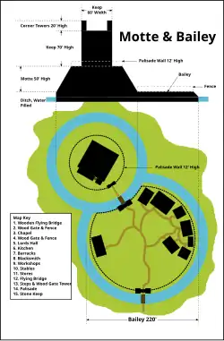Surviving examples of medieval secular architecture mainly served for defense, these include forts, castles, tower houses, and fortified walls. Fortifications were built during the Middle Ages to display the power of the lords of the land and reassure common folk in their protection of property and livelihood.[9] In the early Middle Ages, fortifications were made from wood and earth, these were called Motte and bailey castles. These consist of a stockade or palisade surrounding an enclosed courtyard and man-made mound. This fortification acted as a passive obstacle that potential enemies would have to face to attack the civilization. However, this method of fortification had its downside including being vulnerable to fires so more methods of fortification were created.