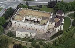 While much of the surviving medieval architecture is either religious or military, examples of civic and even domestic architecture can be found throughout Europe. Examples include manor houses, town halls, almshouses and bridges, but also residential houses. Walled towns were constructed across Europe, including in Austria. The Civic landscape of Europe was built up of the crown, the church, guilds, mayors, and the elite. It was also largely running off of ceremonies that connected these relationships.[12] The examples of the civic architecture mentioned in the last paragraph were mostly owned by the elite or government buildings. For example, manor houses were owned by bishops and located closely in relation to churches. These buildings, due to their higher class ownership, were more large in scale with elements that displayed wealth.[13] They also provide an insight into the social history of the area it sits in through its architecture due to them adapting throughout the years to accommodate what the owner needed most.[14] Majority of these buildings were made of stone while some were also wood framed.[15]