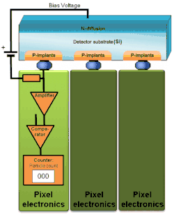 The sensor layer is a semiconductor, such as silicon, GaAs, or CdTe in which the incident radiation makes an electron hole/cloud. The charge is then collected to pixel electrodes and, via bump bonds, conducted to the CMOS electronics layer.