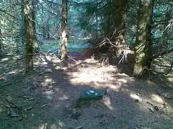 The summit plateau is traversed by a main path from the Tetřeví chata tourist intersection, marked with an informational board indicating an elevation of 1,165 m, to the Medvědí hora (Rysí skála) tourist stop, marked with an informational board indicating an elevation of 1,162 m.[3] The summit plateau is forested with spruce forest and covered with alpine grass. There is a secondary triangulation station on the summit plateau in the form of a benchmark, marked on geodetic maps with the number 22.3, at an elevation of 1,162.20 m and geographical coordinates 50°05′19.06″N 17°08′49.05″E / 50.0886278°N 17.1469583°E, located about 20 m northwest of the summit. On the summit, there is a rock group that serves as a limited viewpoint, offering restricted views towards Dlouhé stráně mountain. The State Administration of Land Surveying and Cadastre lists the highest point – the summit – at an elevation of 1,163.6 m with geographical coordinates 50°05′15.9″N 17°08′49.8″E / 50.087750°N 17.147167°E.[5][6]