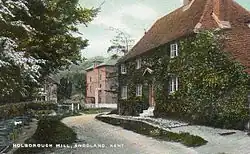 A very ancient mill site, a mill was presented by King Egbert I of Kent to Bishop Beormond of Rochester in 836. In 1100 it was valued at £1. The mill had fallen into disrepair in the early fourteenth century, but was rebuilt by Bishop Hamo Hethe in 1322. The surviving mill building has a cast iron overshot waterwheel, 16 feet (4.88 m) diameter. It was a corn mill.A [34][45]