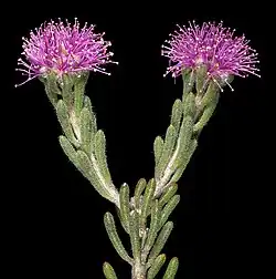 The flowers are a shade of pink to purple and are arranged in heads on the ends of branches which continue to grow after flowering. The heads are 11–14 mm (0.4–0.6 in) in diameter and contain 5 to 7 groups of flowers in threes. The petals are 0.8–1.1 mm (0.03–0.04 in) long and fall off as the flower matures. The stamens are arranged in five bundles around the flower, each bundle containing 2 to 5 stamens. The main flowering season is in October and is followed by fruit which are woody capsules 2.5–3.3 mm (0.1–0.1 in) long.[2][3]