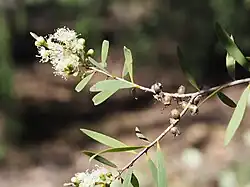 The white flowers are grouped in spikes up to 30 mm (1 in) long at the ends of branches which continue to grow after flowering, and sometimes in the upper leaf axils. Each spike contains 3 to 16 flowers loosely arranged and up to 35 mm (1 in) in diameter. The petals are 3.5–3.8 mm (0.14–0.15 in) and fall off as the flower matures. The stamens are arranged in five bundles around the flower and there are 11 to 26 stamens in each bundle. Flowering occurs in early spring but the flowers are relatively short-lived. The fruit are woody, cup or barrel-shaped capsules 4–5 mm (0.16–0.20 in) long, 4–7 mm (0.2–0.3 in) in diameter and spaced along the branches.[2][3][4][5]
