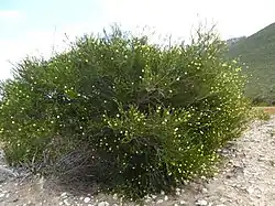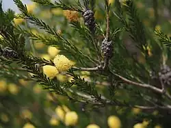 The bright yellow flowers are arranged in oval-shaped spikes, often on the ends of branches which continue to grow after flowering. The spikes contain 10 to 18 groups of flowers in threes, densely packed together, each spike up to 25 mm (1 in) long. The stamens are in five bundles around the flower, each bundle with 5 to 9 stamens. Flowering occurs in late spring and the fruit which follow are rounded, woody capsules 2–5 mm (0.08–0.2 in) long in tight clusters along the stem.[2][3]