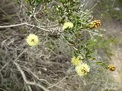 The flowers are bright yellow, and arranged in a spike or a head near the ends of branches. The heads are up to 15 mm (0.6 in) in diameter and contain 2 to 15 groups of flowers in threes. The stamens are arranged in five bundles around the flower, each bundle with 7 to 11 stamens. Flowering occurs from August to February but mainly in October and November. The fruit which follow are woody capsules 2.3–4 mm (0.09–0.2 in) long in clusters of about six which are about 10 mm (0.4 in) in diameter. The rim of the fruit are flat.[2][3]