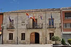 The Melgar de Fernamental Town Hall is located in Melgar de Fernamental, Spain. Placed in the center of Spain Square, it is built in plateresco style. Its reduced arch front gate is flanked of pilasters, crowned with a central balcony accompanied of columns. Likewise, it presents coats of arms. The coat of arms of the town is shown on the top part of the central balcony.