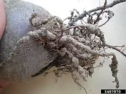 Root symptoms are similar to those caused by all nematodes including a reduction in number of feeder roots and root stunting, but root knot nematodes cause unique symptoms on roots and pods. Nematodes cause galls (knots) to form on both roots and pods of the peanut, and these galls are highly diagnostic for root-knot nematode presence compared to other nematodes affecting peanut. The presence of galls on roots, pegs and pods appears as single or multiple wart-like growths that may or may not be discolored. As root knot nematode infection progresses, and generally later in the season, secondary root and pod rots cause further damage and eventual death of the plants.[9]