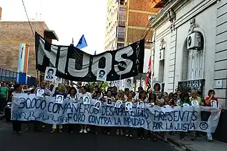 In April 1995, a new organization called HIJOS (Hijos e Hijas por la Identidad y la Justicia contra el Olvido y el Silencio) emerged, whose acronym expresses the basic guidelines of the organization: Sons and Daughters for Identity and Justice against Oblivion and Silence, which was originally composed of children of detainees, the disappeared and ex-convicts. In the context of the total absence of any possibility of investigation and legal condemnation for those responsible for the disappearances, kidnappings, torture and deaths of thousands of people, this organization built a new and different tool, also oriented towards condemnation, but anchored in the social and political spheres.[9]