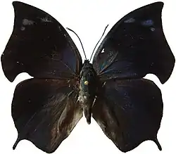 Memphis boliviana is a butterfly with forewings with a humped costal edge, pointed apex and concave outer edge. Each hindwing bears a tail. The upper part is navy blue, almost black. The underside is dark grey, almost black and simulates a dead leaf.Seitz-A. boliviana Druce (120 B b, c) from Bolivia is of very dim colours. The male is above deep bluish black, the lightest is the basal area of the forewings, near the apex of the forewing starts a band consisting of 3 spots and running towards the inner margin. The female is beneath lighter brown than the male and has 3 grey spots between the tail and the anal angle. The metal gloss of the upper surface has not the bright shine of the preceding species, but it remains considerably duller, particularly in the male.[2][3][4]