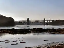 The strait is bridged by the Menai Suspension Bridge (Pont Grog y Borth), which was completed in 1826 to a design by Thomas Telford and carries the A5 road, and the Britannia Bridge (Pont Britannia) a truss arch bridge which carries the North Wales Main Line and the A55 road; it is an adaptation of a tubular railway bridge completed in 1850 to a design by Robert Stephenson, which was severely damaged by a fire in 1970.