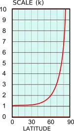 - at latitude 45° the scale factor is k = sec 45° ≈ 1.41,