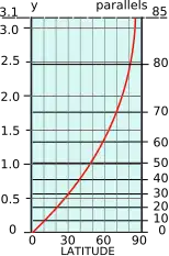 The function y(φ) is plotted alongside φ for the case R = 1: it tends to infinity at the poles. The linear y-axis values are not usually shown on printed maps; instead some maps show the non-linear scale of latitude values on the right. More often than not the maps show only a graticule of selected meridians and parallels.