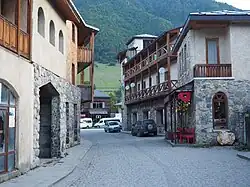 The townlet is dominated by stone defensive towers of a type seen in Ushguli and Mestia proper ("Svan towers"). A typical Svan fortified dwelling consisted of a tower, an adjacent house (machubi) and some other household structures encircled by a defensive wall.