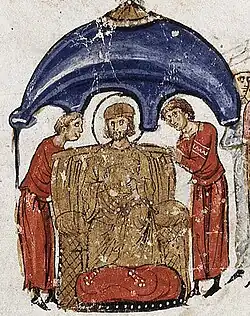 Coronation of Michael I and his son Theophylact (left) upon a shield, from the 12th-century Madrid Skylitzes, probably drawn from an earlier unrelated source.[2][3]